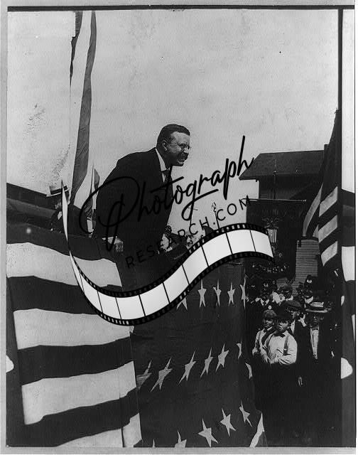 Speech,President Theodore Roosevelt,platform,flags,Brattleboro,VT,Vermont,c1907