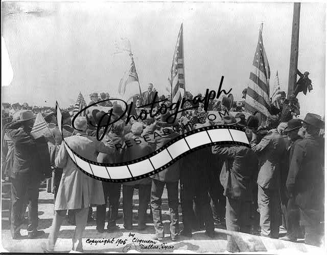 President Theodore Roosevelt,platform speaking,group,veterans,crowds,c1903