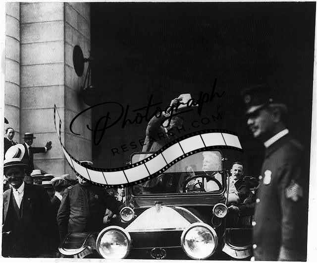 Theodore Roosevelt,open automobile,convertible,waving his hat,crowds,police,1901