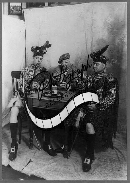 Two men wearing kilts,smoking cigar,table drinking Sandy MacDonald scotch,c1913
