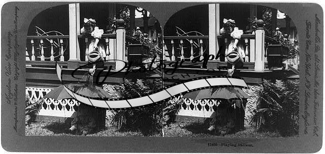 Photo of Stereograph,Playing Shower,Girl pouring water on Umbrella,Children Play