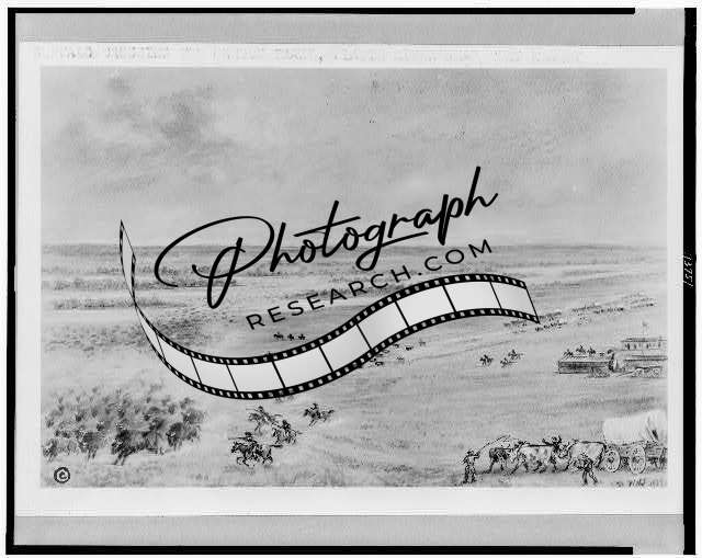 Buffalo Crossing Oregon Trail,men on horseback shooting,Platte River,Fort Kearny