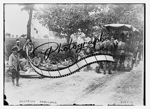 Austrian ambulance,men laying on cots,outside,Bain News Service