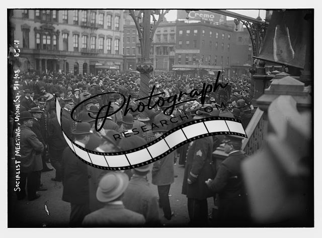 Socialist Meeting,Union Square,May 1,1908,policemen,crowd gathered,Cremo sign