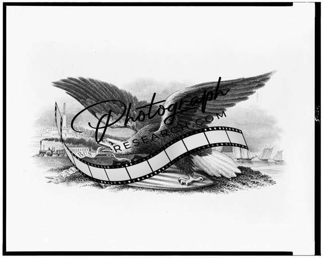 Title: [Proof for bank note vignette, showing eagle and arrows on shield, with stars and stripes, sailing ships, and train in background]