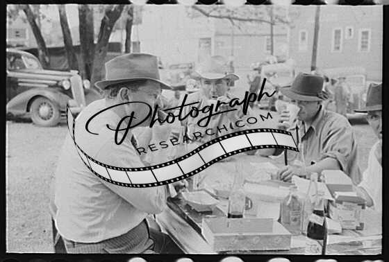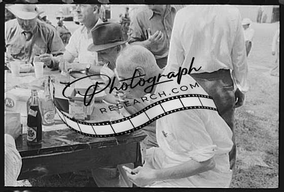Title: Brunswick stew dinner in front of the tobacco warehouse on opening day of the auctions. Prepared by Parent Teachers Association of Prospect Hill, to raise money for a new gymnasium for the Prospect Hill Consolidated School in Caswell County, North Carolina