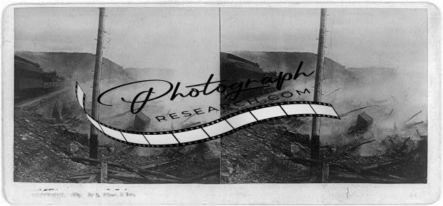 Reproduction,Johnstown Disaster,Flood,Pennsylvania,PA,debris on fire,bridge,1889