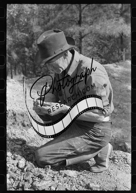 Title: Prospector putting tin can containing his claim deed into his monument on his claim. Pinos Altos, New Mexico
