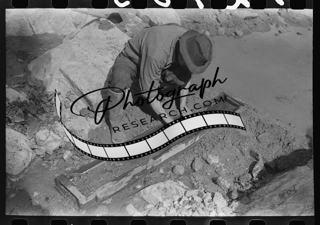 Title: Prospector taking a sample of dirt from creek bed which contains scattered gold. Pinos Altos, New Mexico