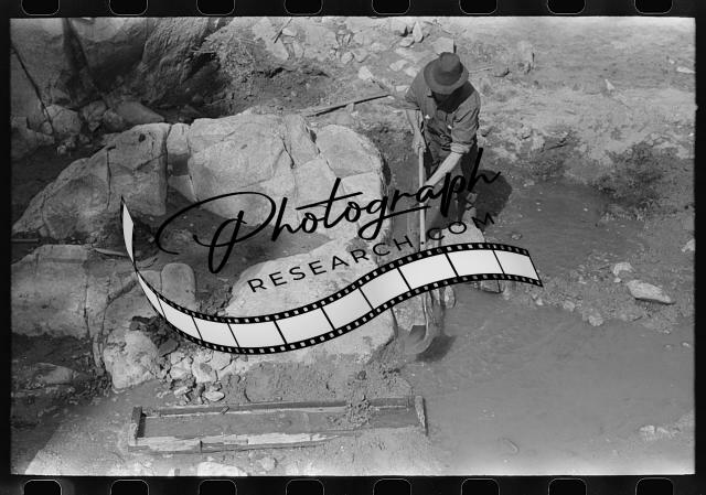 Title: Prospector taking a sample of dirt from creek bed which contains scattered gold. Pinos Altos, New Mexico