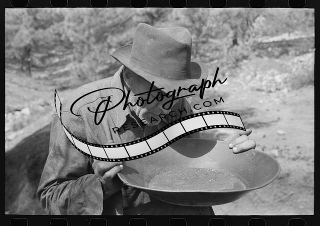 Title: Gold prospector examining a pan to see how much gold it contains. Pinos Altos, New Mexico