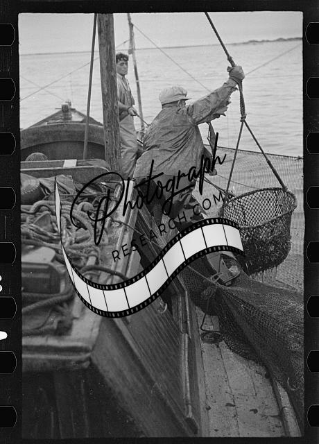 Title: Aboard a trap fishing boat. Approaching the trap or 'weir' at five o'clock in the morning. The trap consists of a large circle of net with a long funnel-like entrance set in to the tide stream. Fish which always swim with the tide, must be collected before tide turns. Provincetown, Massachusetts