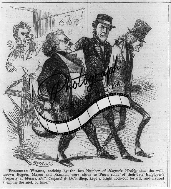 Cartoon,1861,Policeman Wilkes,Rouges,Mason and Slidell,Pawn Property,caught