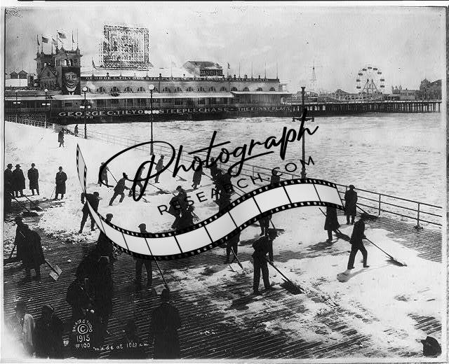Men clearing snow off Boardwalk,Atlantic City,New Jersey,NJ,Easter Sunday,1915