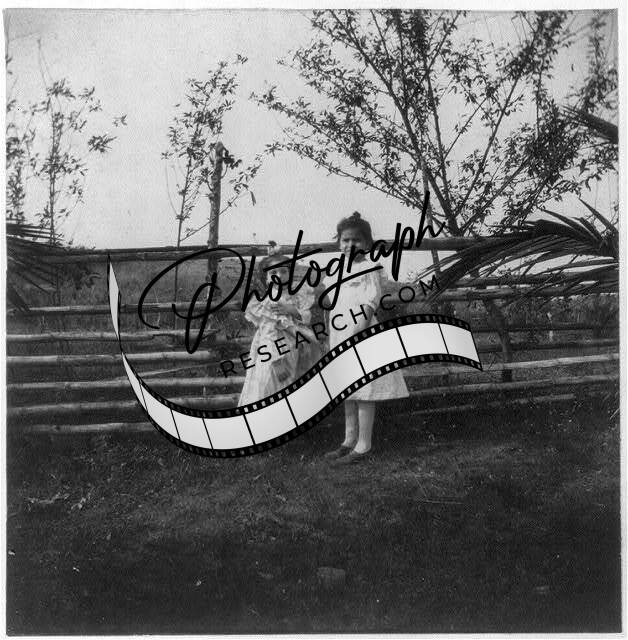 Puerto Rico,1898-1900,2 small girls,fence,outside,dress