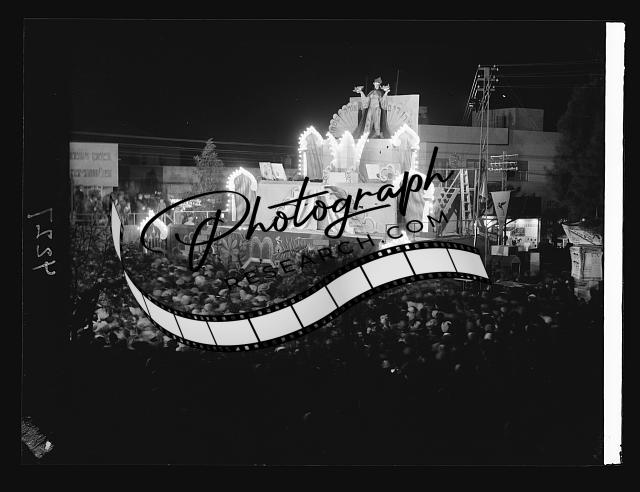 Title: Purim Carnival in Tel Aviv. 1934. Purim celebration in Tel Aviv. Night crowds under a canopy of lights