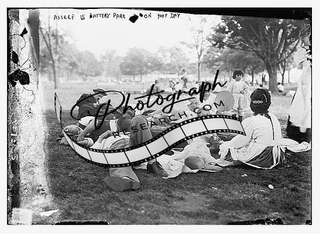 Asleep in Battery Park on a hot day,children,people,grass,trees,Bain News