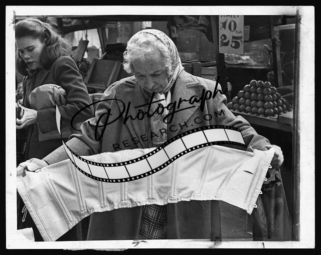 Woman examining corset at a pushcart market on Belmont Avenue,Brooklyn,New York
