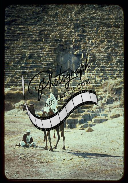 On slide mount: Pyramid and camel rider reflected in Nile overflow.