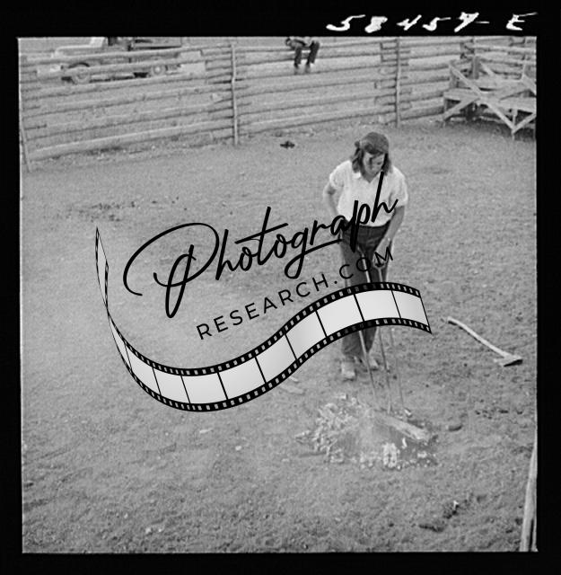 Title: Dudes helping brand a dogie (Hereford calf) in the corral at Quarter Circle U, Brewster-Arnold Ranch Company. Birney, Montana