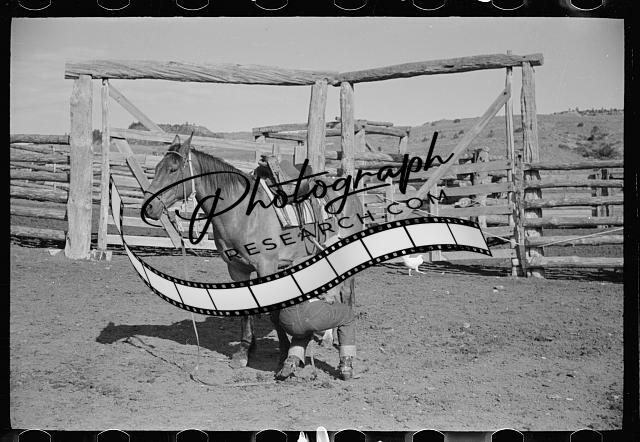 Title: Cowboy mounting horse, Quarter Circle U Ranch, Big Horn County, Montana