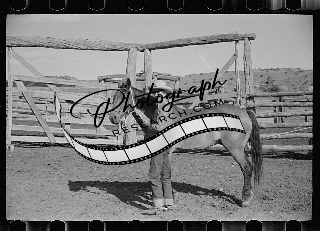 Title: Saddling a horse, Quarter Circle U Ranch, Big Horn County, Montana