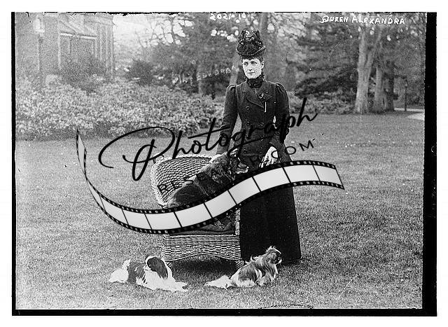 Queen Alexandra of Denmark,1844-1925,posed outside on lawn with three dogs