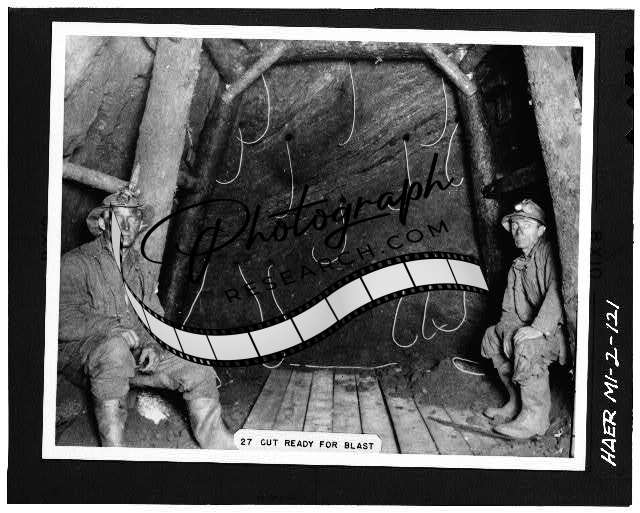 Title: 124. Photocopied July 1978. (QMC) UNDERGROUND VIEW OF THREE MINERS CUTTING MASS COPPER BY HAND. C. 1890. - Quincy Mining Company, Hancock, Houghton County, MI