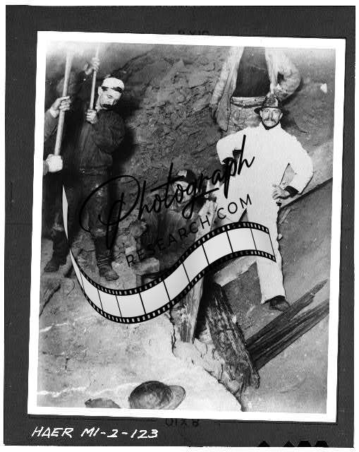 Title: 127. Photocopied July 1978. EMERGENCY CREW (FIRE-FIGHTERS) READY TO DESCEND IN MAN-CAR AT NO. 6 SHAFT. NOTE ROCK-SKIP SUSPENDED OUT OF THE WAY. JULY 1927. - Quincy Mining Company, Hancock, Houghton County, MI