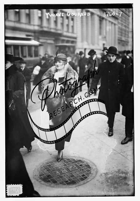 Yvonne Gouraud,woman walking down sidewalk,wearing fur,Bain News Service