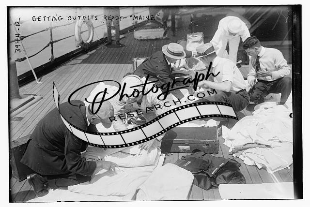 Getting outfits ready,MAINE,suitcases,sailors,deck of ship,vessel,Bain News