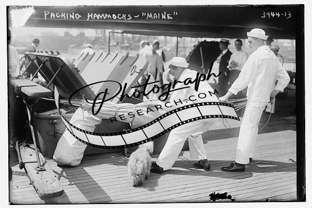 Packing hammocks,MAINE,sailors,deck of ship,dog,Bain News Service