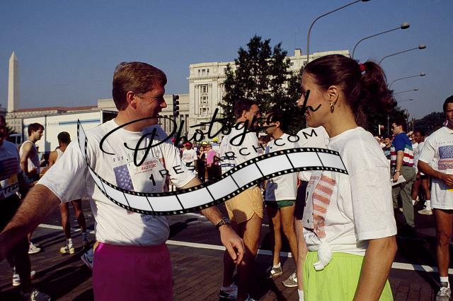 Title: Vice President Dan Quayle and Second Lady Marilyn Quayle, to the right of the podium, at a Race for the (Cancer) Cure run in 1990, Washington, D.C.