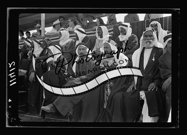 Title: Race meeting (horse & camel). Beersheba. H.E. (i.e., His Excellency) the High Commissioner (close up) among crowds in fr[ont] of grand stand