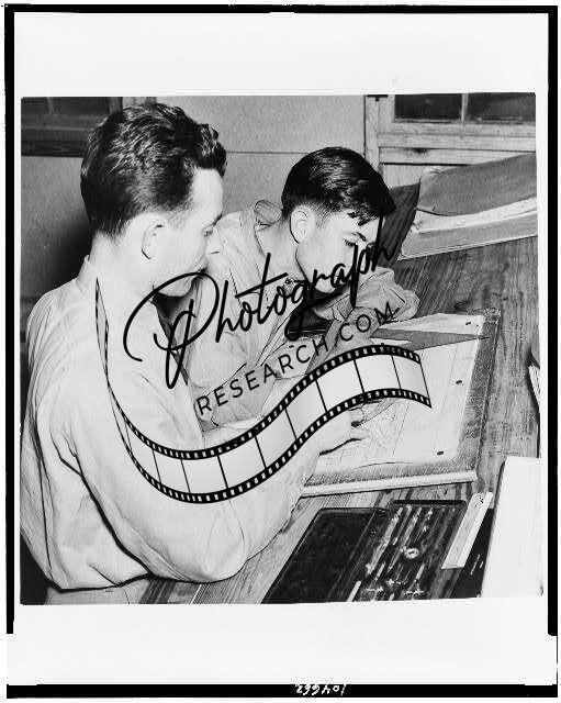 US Civilian Conservation Corps enrollees drafing maps,young adults,men,1937
