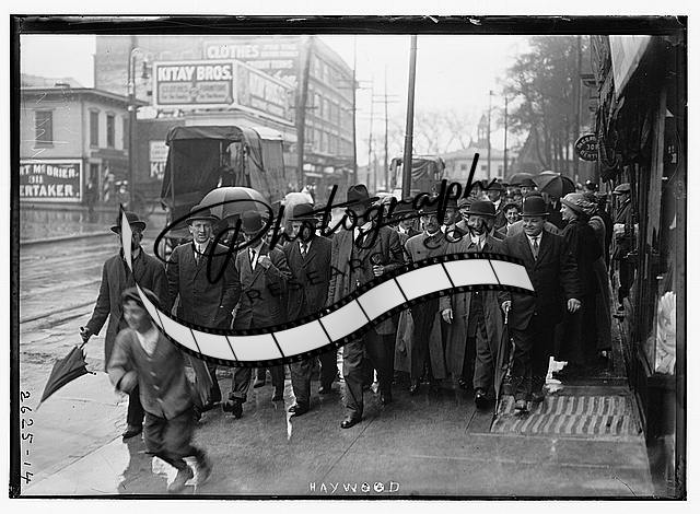 Haywood,group of people,sidewalk,raining,umbrellas,Kitay Bros. sign,1910-1915