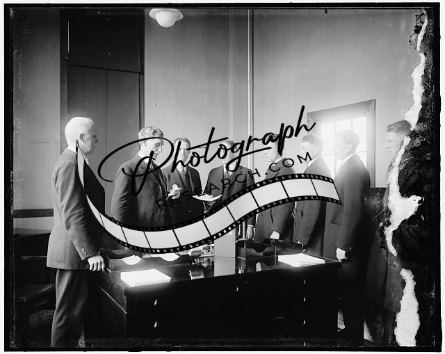 Title: Railroad Executives J.M. Herbert; Smuel Rea; A.H. Smith; DeWitt Styler; Alred P. Thnom(?); C.E. Loomis; standing: L to R: B.M. Rubinson; F.D. Underwood; J. Kruttschnitt; E.N. Brown; Daniel Willard; W.H. Finley; W.B. Story; W.W. Aterbury.