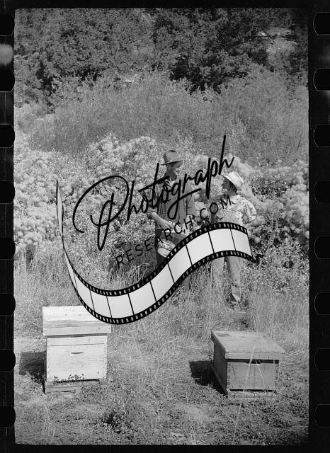 George Arnold,his son inspect some of the hives,farm,Chaffee County,Colorado,4