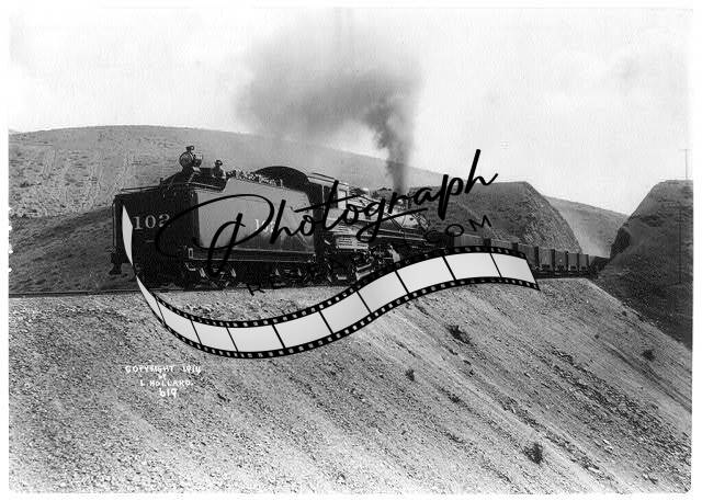 Locomotive no. 102 bringing railroad cars through gap,Utah,UT,c1914,RR,train