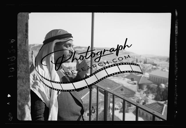 Muezzin calling hour of prayer from Saladin's Minaret,January 1939,Jerusalem