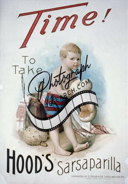 Time to take Hood's Sarsaparilla,1894,Little boy,boxing gloves,wash pail,photo