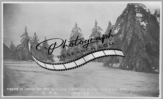 Trees in front of mission,ladened with volcanic ash,Alaska,AK,Volcanic Eruptions