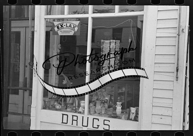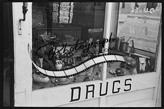 Drugstore window,Ray,North Dakota,ND,Farm Security Administraiton,FSA,1937