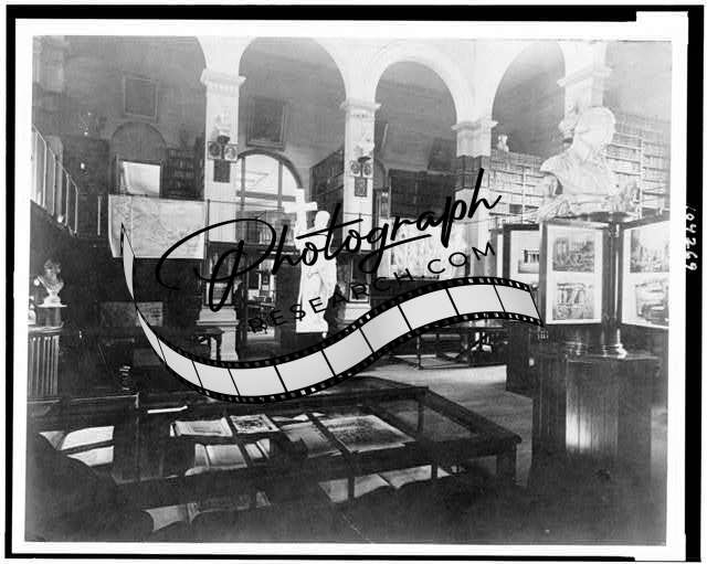 Interior,library,showcases,artwork,bookstacks,Worcester,Massachusetts,MA,c1905