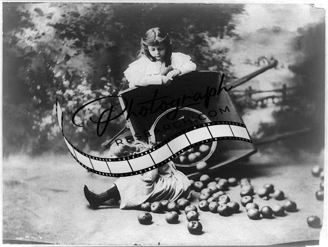 In trouble,c1903,2 girls with upset wheelbarrow,spilled apples,children