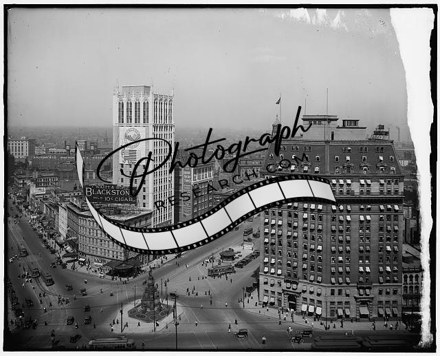 'Detroit Patriotic Fund' on sign on side of Real Estate building; Campus Martius and Soldiers' and Sailors' Monument at center.