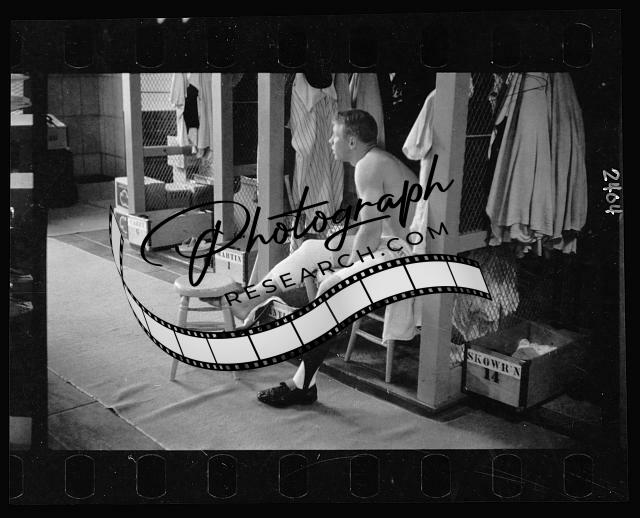 Mickey Mantle, New York Yankee baseball player, in uniform, sitting in locker room holding a bat