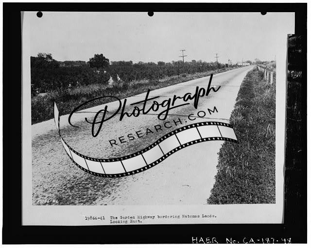 Title: 47. Photocopy of photograph (original photograph in possession of Sacramento Archives and Museum Collection Center, Sacramento, California) Original photographer and year unknown. THE GARDEN HIGHWAY BORDERING NATOMAS LANDS LOOKING WEST. SACRAMENTO RIVER TO THE LEFT AND PEAR ORCHARDS TO THE RIGHT. - Reclamation District 1000, Northwest Sacramento County & southwest Sutter County, bisected by State Highway No. 99, Sacramento, Sacramento County, CA