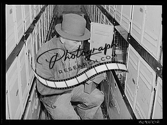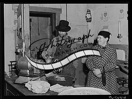 Farmer coming out of cold storage lockers with meat to take home. North Dakota