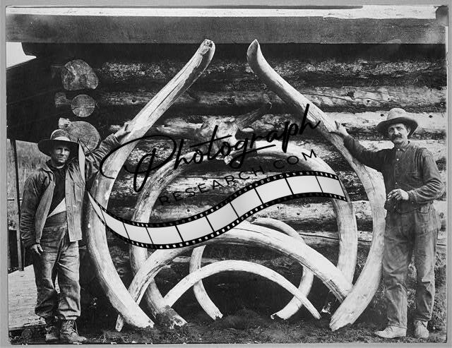 Ancient bones of mastodons,1900-1930,Log Building,Men,Alaska,AK,United States